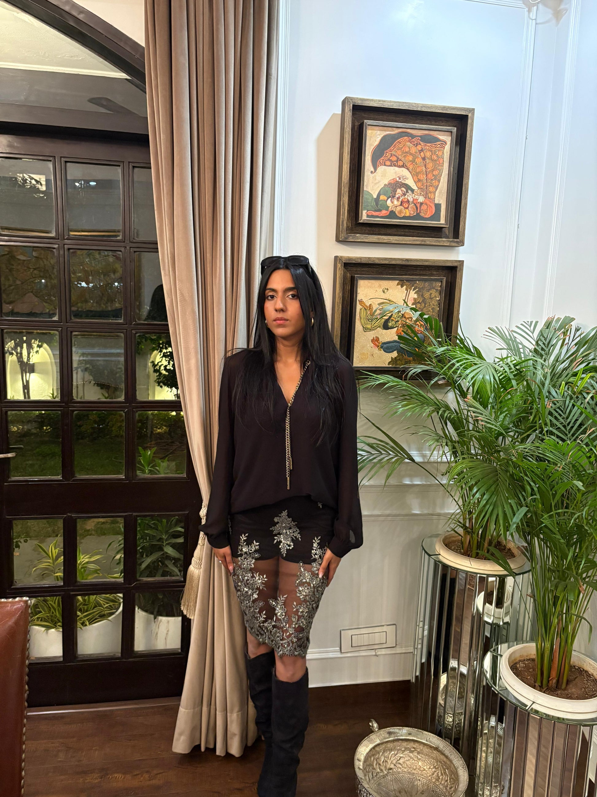 A sheer black lace midi skirt with metallic silver detailing that catches the light with every step. Designed to sit effortlessly on the body, it layers beautifully over shorts or a slip for a sculpted, evening-ready look.